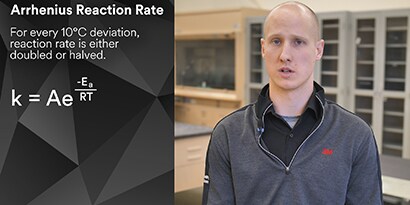 The Arrhenius equation is a formula for the temperature dependence of a reaction. As a general guideline, for every deviation of 10 degrees Celsius you double or halve the reaction rate. Take as an example an adhesive that has an open time of 20 minutes at 25°C, or room temperature. If you change the temperature to 35°C you would cut that open time in half, to about 10 minutes. In the other direction, if you reduced the temperature to 15°C you would have closer to 40 minutes total open time.