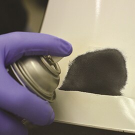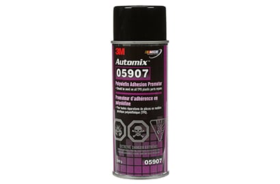 Blow off the repair area with clean, dry compressed air and apply a light coat of 3M™ Polyolefin Adhesion Promoter (aerosol) evenly to the repair area, coating all bare plastic.